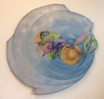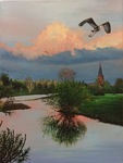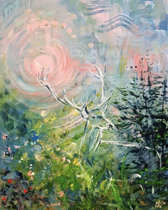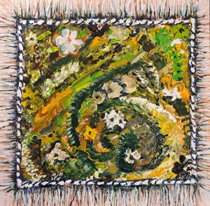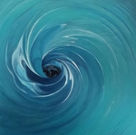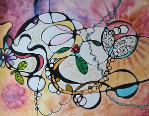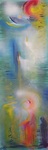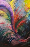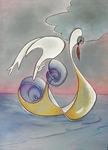 2018Vooraf intuitief met ogen dicht aantal tekeningen gemaakt. Deze vorm uitgekozen om te schilderen. Zo ontstond als vanzelf een soort zwaantje. Effect: glas in lood.