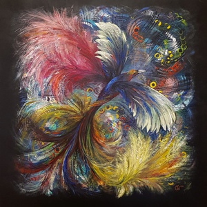2018Vooraf intuitief met ogen dicht aantal tekeningen gemaakt. Deze vorm uitgekozen om te schilderen. Zo ontstond als vanzelf een soort zwaantje. Effect: glas in lood.