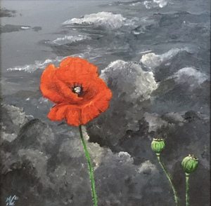 2020Vanuit liggende positie bezien, waarbij de kleur van de klaproos tegen de achtergrond van een grijze lucht nog intenser wordt.